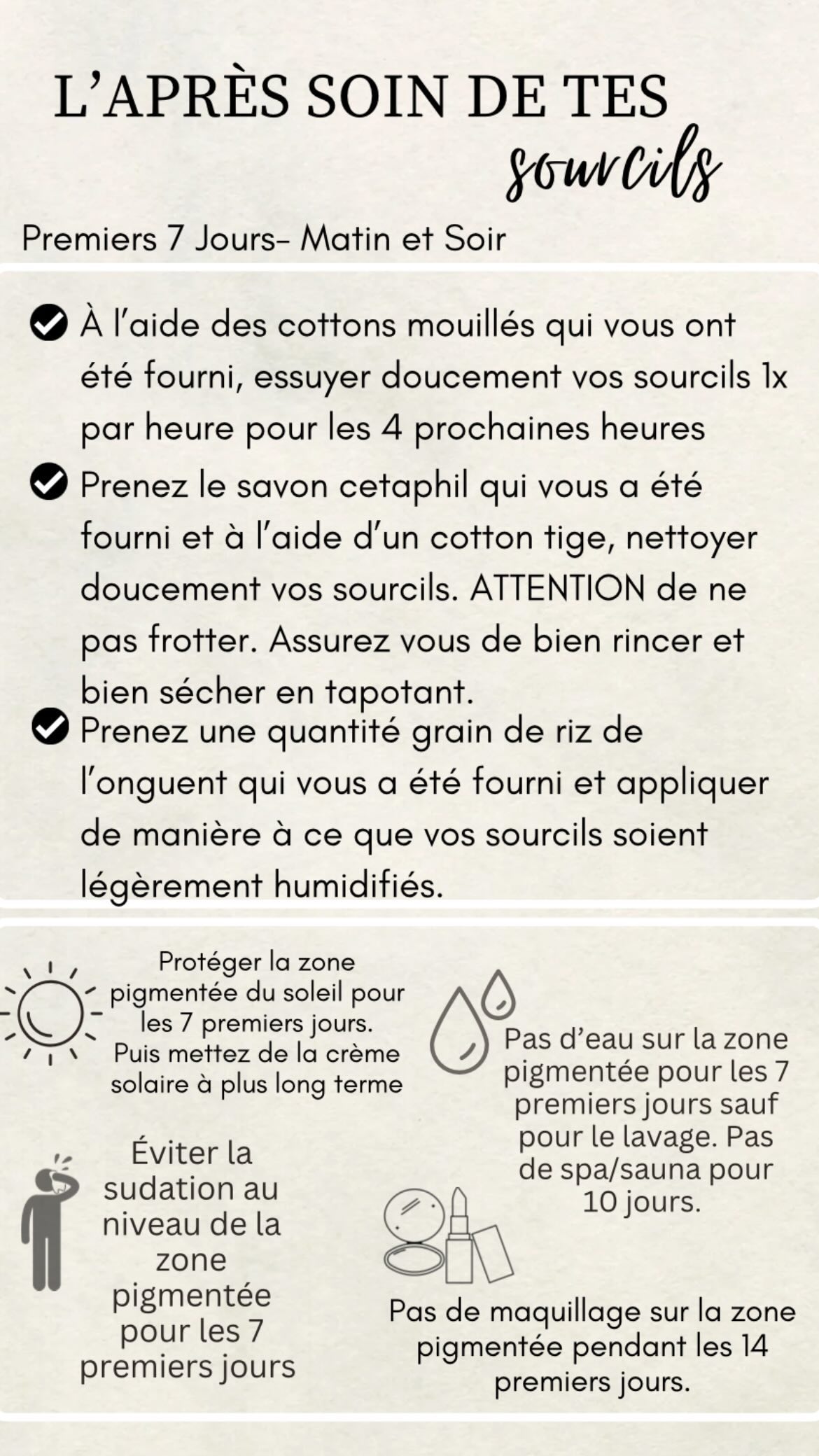 - Éviter l’eau : Gardez la zone des sourcils sèche pendant les premières 7 à 10 jours.